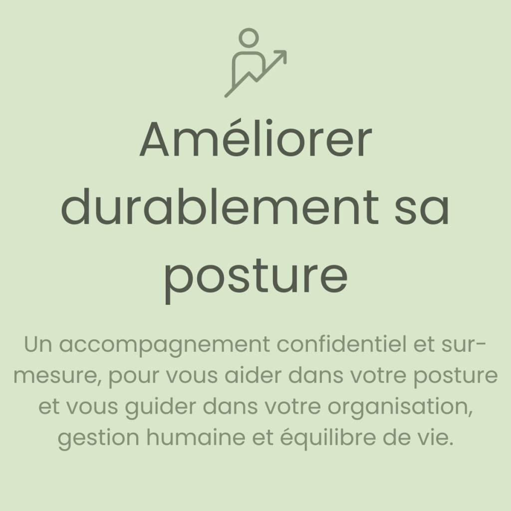 | 3 / – POSTURE – La manière dont vous vous tenez dans votre rôle et vos responsabilités. Nous explorons : >> réaction vs décision >> contrôle vs cadre >> sur-responsabilisation vs juste place >> positionnement intérieur du dirigeant / manager C’est là que nous faisons un travail fin et différenciant. |