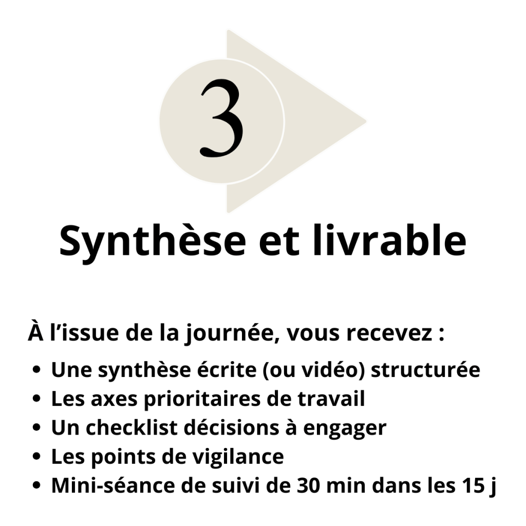 La Journée stratégique est un format intensif, structurant et exigeant. Une journée complète pour remettre de la clarté, de la solidité et des décisions justes au cœur de votre rôle.
